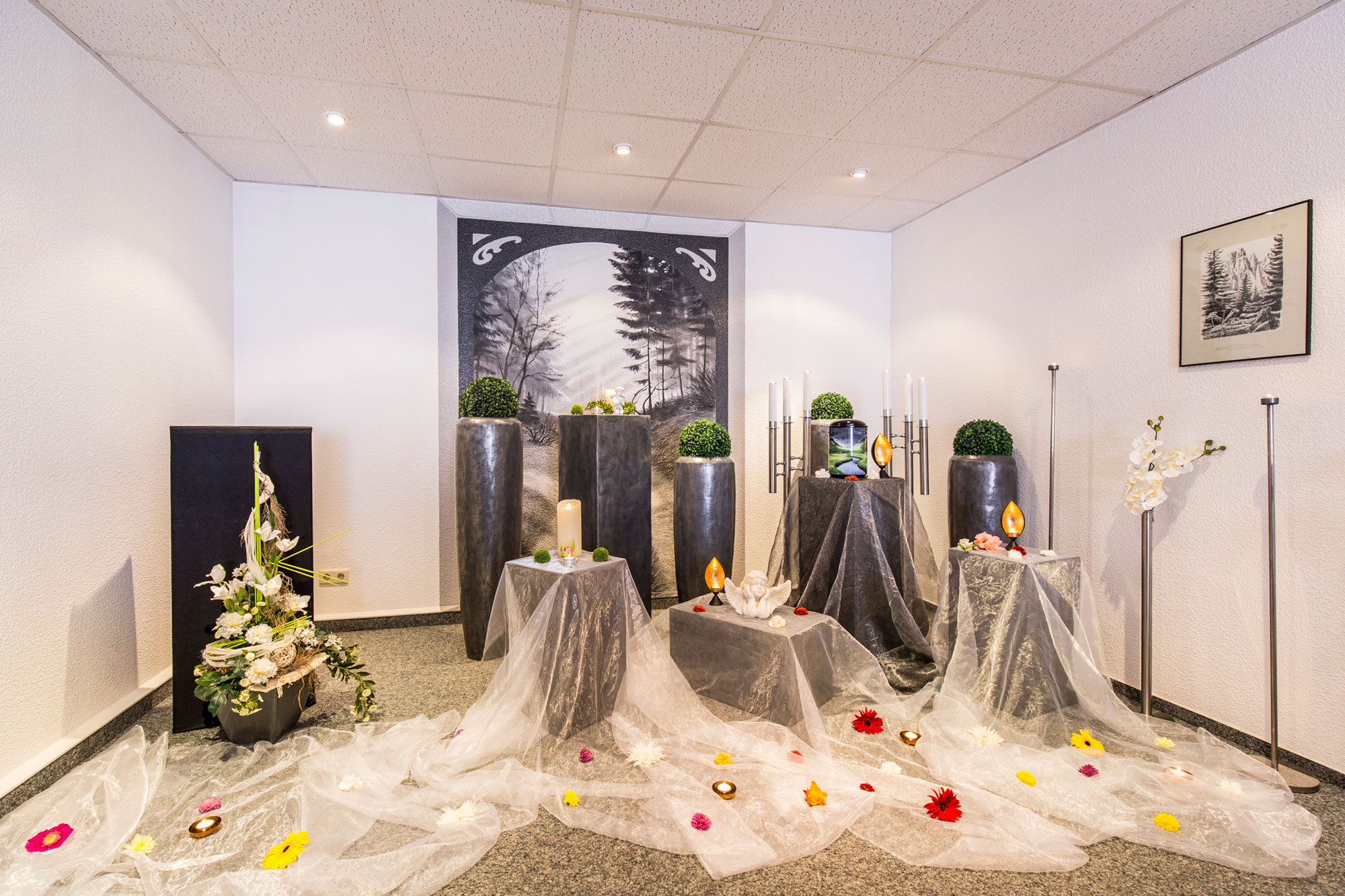 - Auswahl von Särgen, Urnen und floraler Dekoration